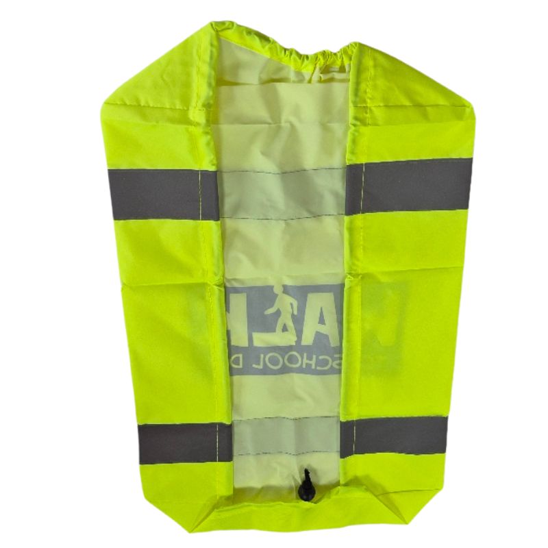 Reflective bag cover with drawstring and adjuster bead.